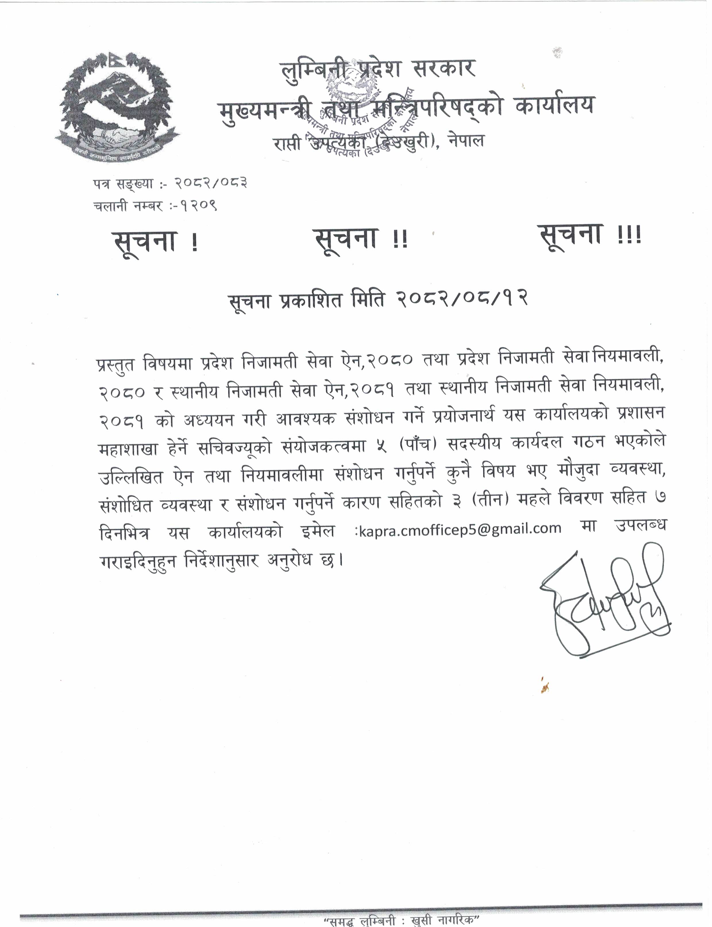 प्रदेश निजामती सेवा ऐन तथा नियमावली र स्थानीय निजामती सेवा ऐन तथा नियमावलीको संशोधन गर्नुपर्ने कारण सहितको विवरण पेश गर्ने सम्बन्धी सूचना।