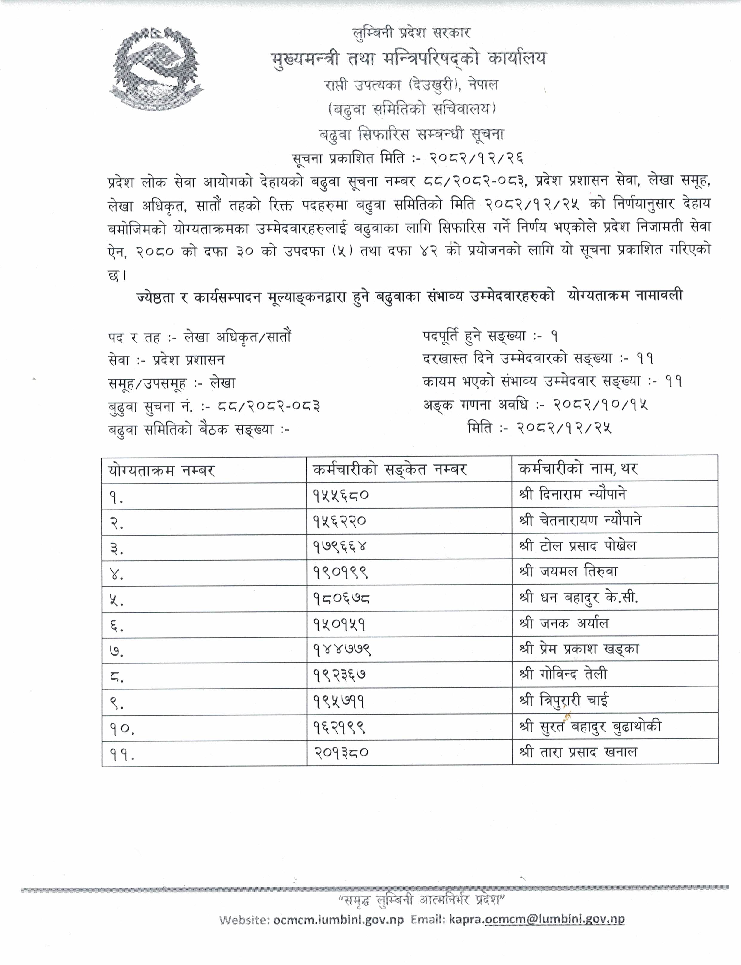 जेष्ठता र कार्यसम्पादन मूल्याङ्कनका आधारमा विभिन्न मितिमा बढुवा भएका सम्भाव्य उम्मेदवारहरूको योग्यताक्रम नामावली